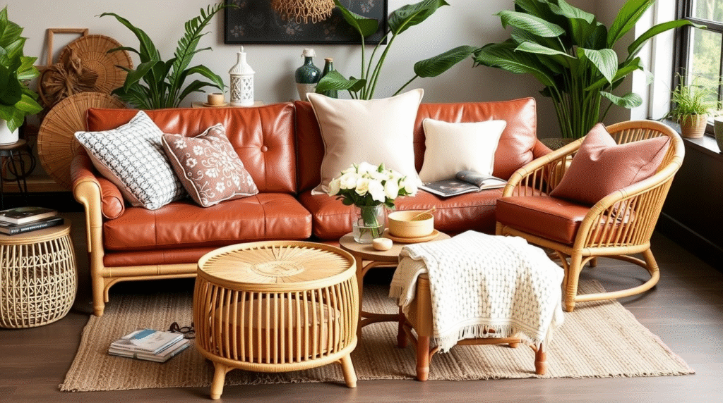 • Mixing Accessories: Add rattan baskets near a leather couch or throw leather cushions on a rattan chair for subtle balance.